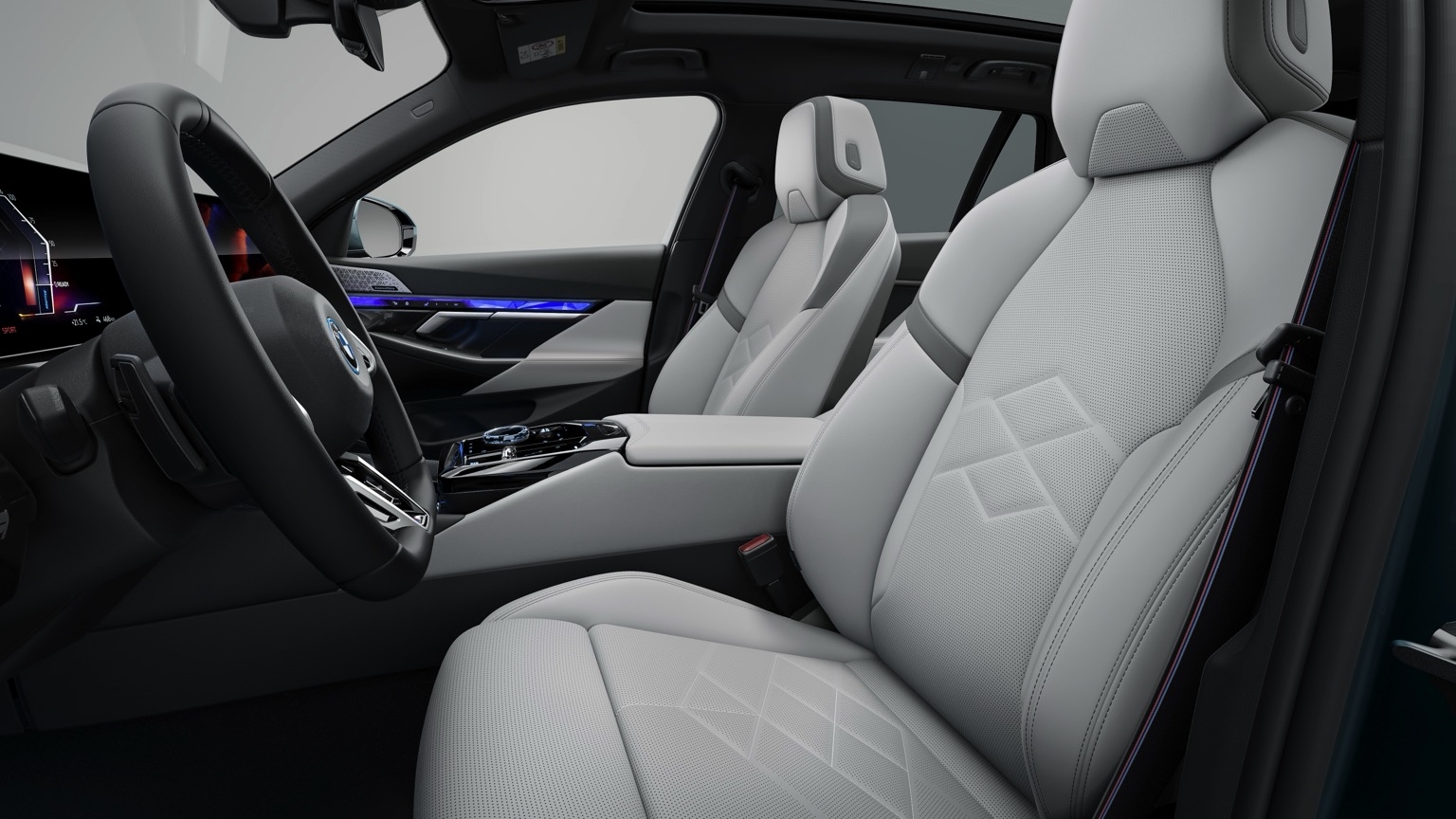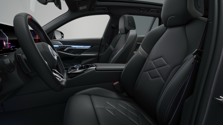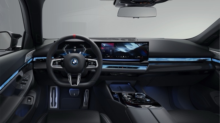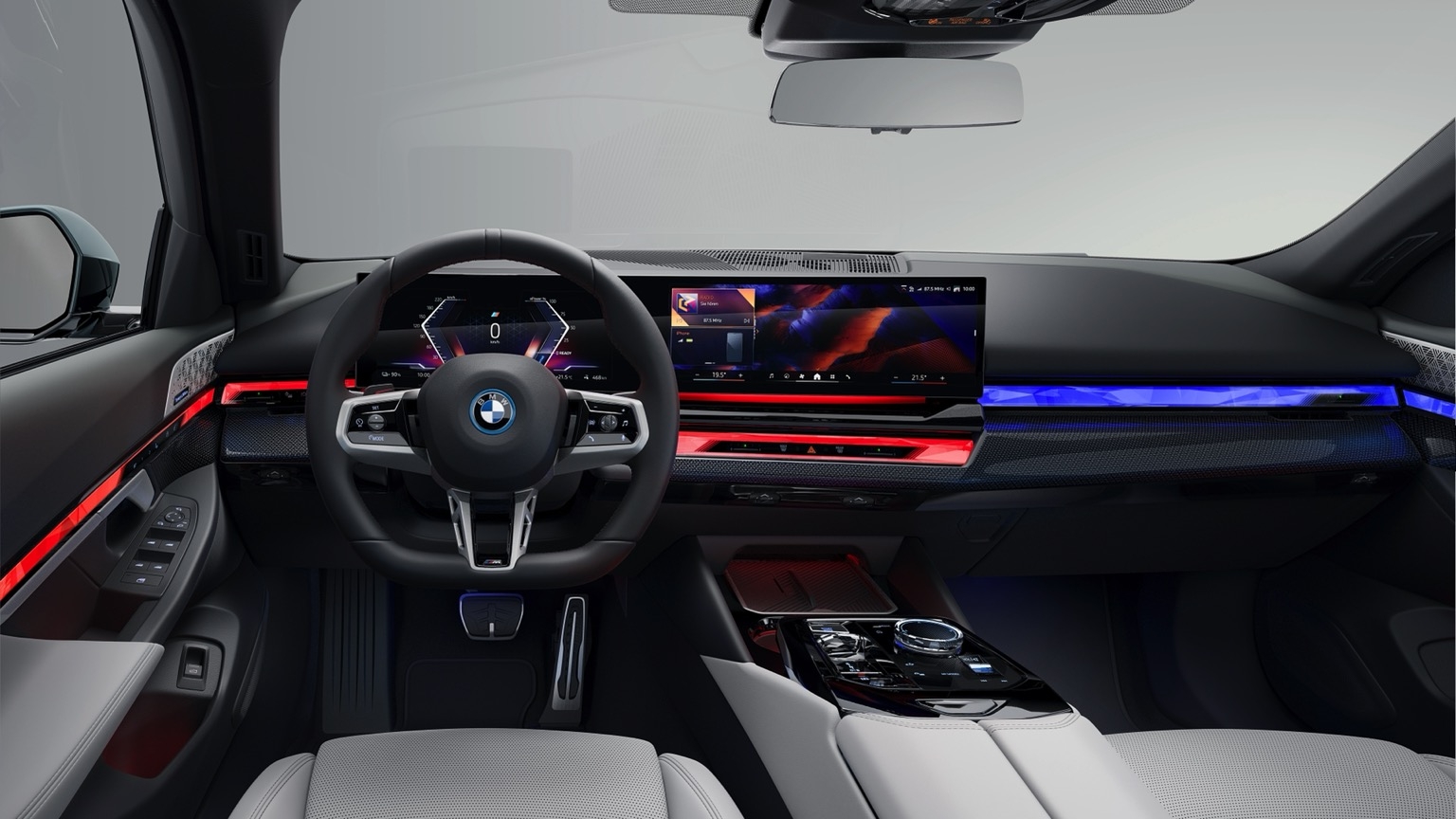 Im Innenraum distanziert sich der i5 deutlich von der Nüchternheit eines Tesla und der verspielten Opulenz des Mercedes Hyperscreens. BMW setzt auf ein fahrerorientiertes Cockpit, dominiert von dem großen “Curved Display”, das Instrumentenanzeige und den zentralen Touchscreen vereint. Die Materialqualität und Verarbeitung sind auf dem gewohnt exzellenten BMW-Niveau und fühlen sich hochwertiger an als im direkten Konkurrenten von Mercedes.