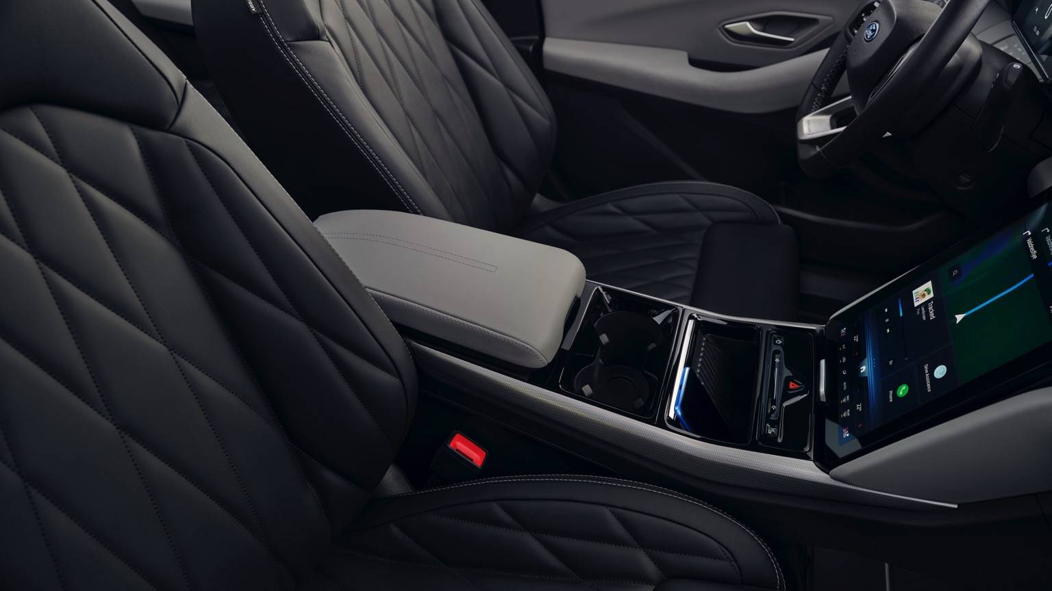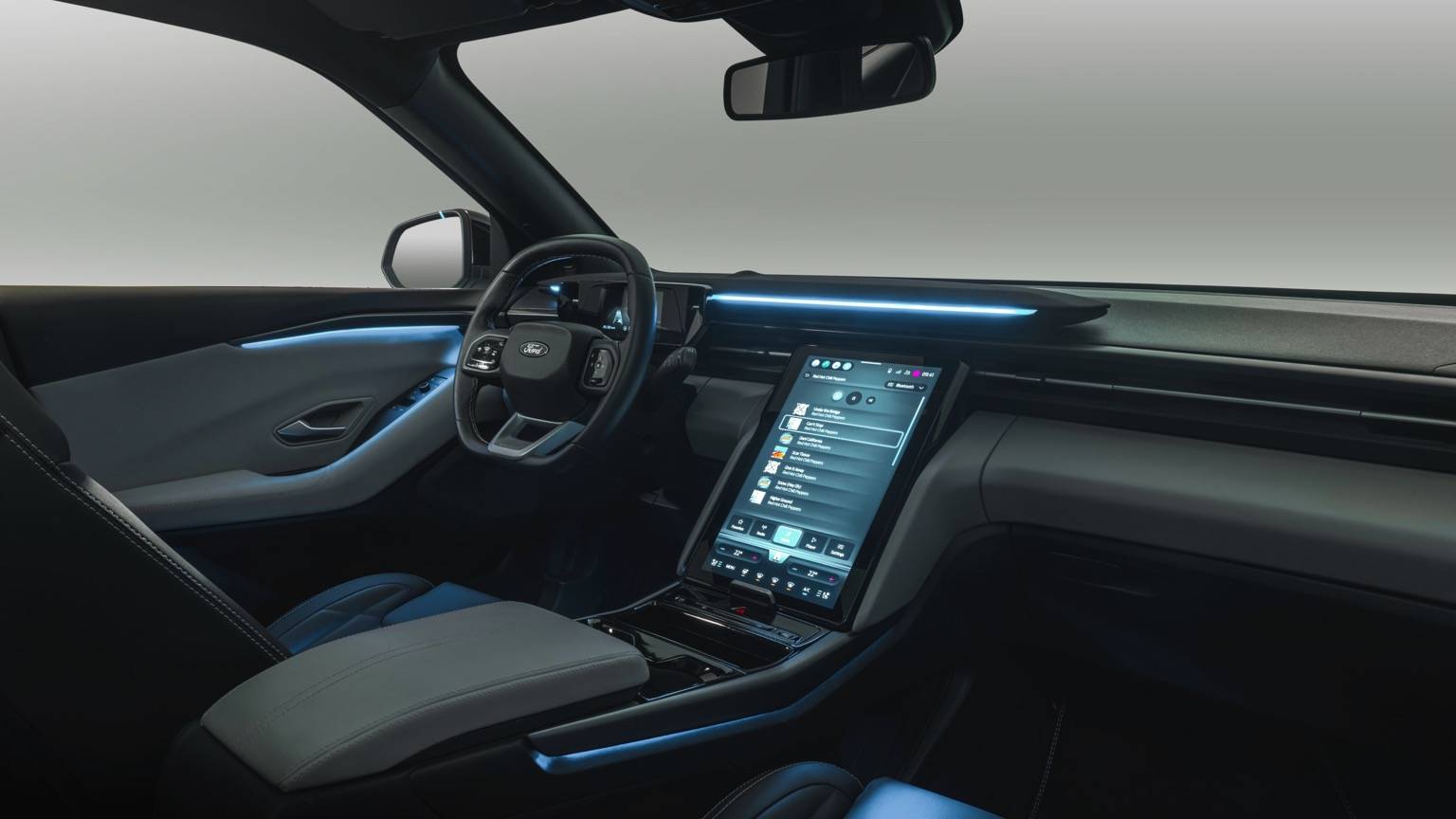 Im Innenraum setzt sich der pragmatische Ansatz fort. Das Cockpit ist aufgeräumt und funktional. Ein kleines, 5,3 Zoll großes Display hinter dem Lenkrad zeigt die nötigsten Fahrinformationen an. Die Hauptrolle spielt der riesige, hochformatige und verstellbare 14,6-Zoll-Touchscreen in der Mitte, der über das Ford SYNC Move System gesteuert wird.